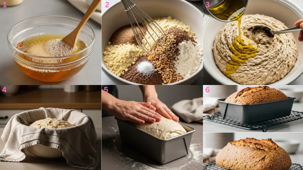 Oil your loaf pan well (or line with parchment). Scrape the dough into the pan, wet your fingers, and smooth the top; let it rise 30–45 minutes, until the highest point is about 1 inch over the rim.