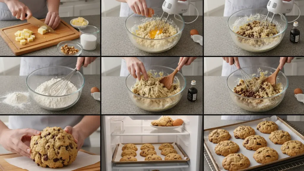 Divide the dough into 8 equal portions (about 6 ounces each) for bakery-sized cookies, or 12 portions for slightly smaller versions. Shape into rough balls – don’t smooth them too much as the craggy surface creates perfect texture. Chill for 30 minutes.
